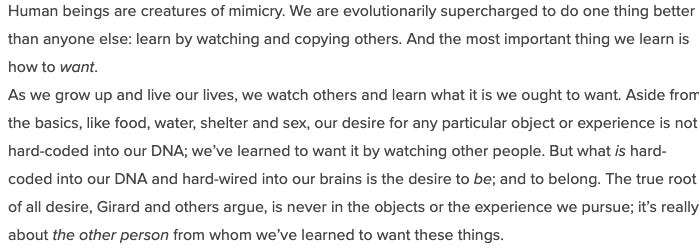 Ever since Peter Thiel mentioned him, reading Rene Girard’s work has become become the ‘hip’ thing to do in tech circles (ironically enough). This essay is one of the best introductions/summary to Rene’s key ideas. Excerpt: